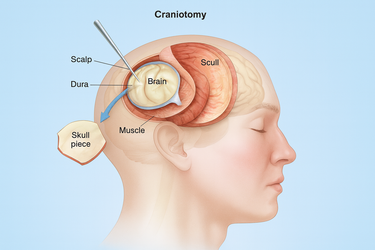 A craniotomy is a surgical procedure where a small section of the skull is temporarily removed to access the brain. It is done to treat conditions like tumors, blood clots, injuries, or infections. After the treatment, the bone piece is placed back securely.