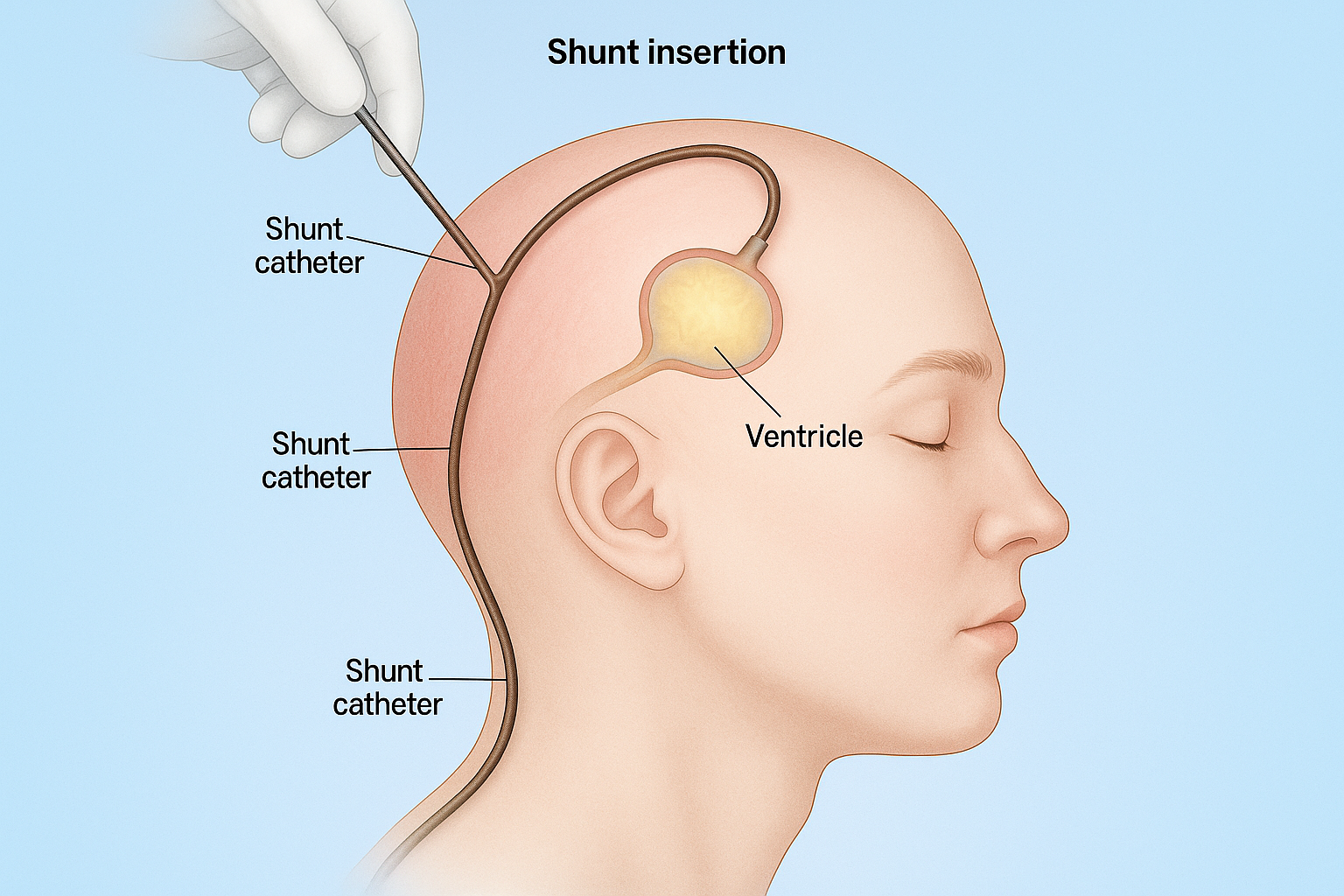 Shunt insertion is a procedure to treat excess fluid buildup in the brain (hydrocephalus). A thin tube called a shunt is placed to drain the extra fluid from the brain to another part of the body, helping relieve pressure and prevent symptoms like headaches, nausea, or balance issues.